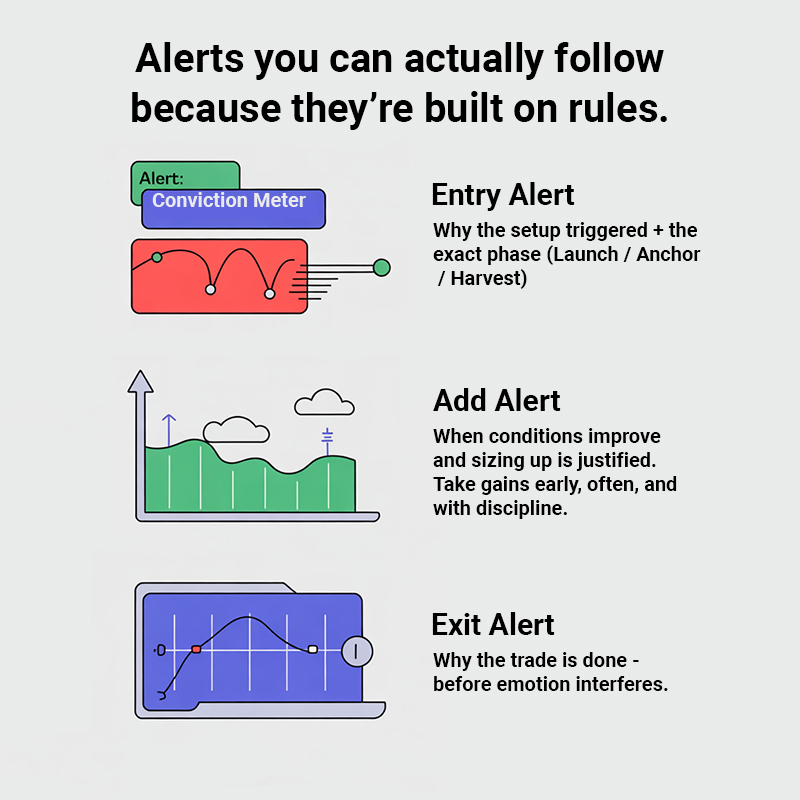 It’s structured, rules-based swing trading — with every alert tied to a defined phase in the trade.